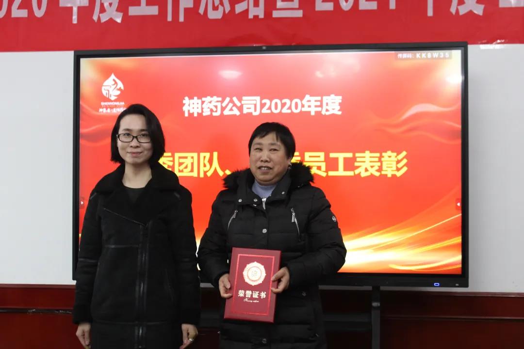 因在2020年工作綜合表現(xiàn)(德能勤績(jī))突出獲此殊榮,并由神農(nóng)架道地藥材公司總經(jīng)理助理劉娜(左)為其頒獎(jiǎng)。