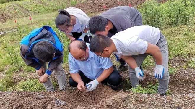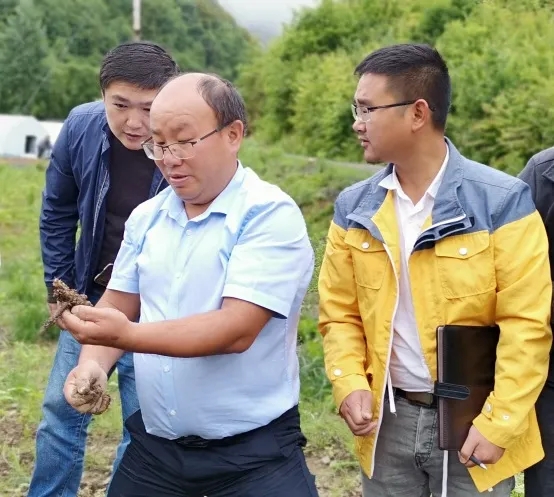 上圖為湖北中醫(yī)藥大學(xué)劉大會(huì)教授(中)與神藥公司科研人員現(xiàn)場勘查天麻種植情況