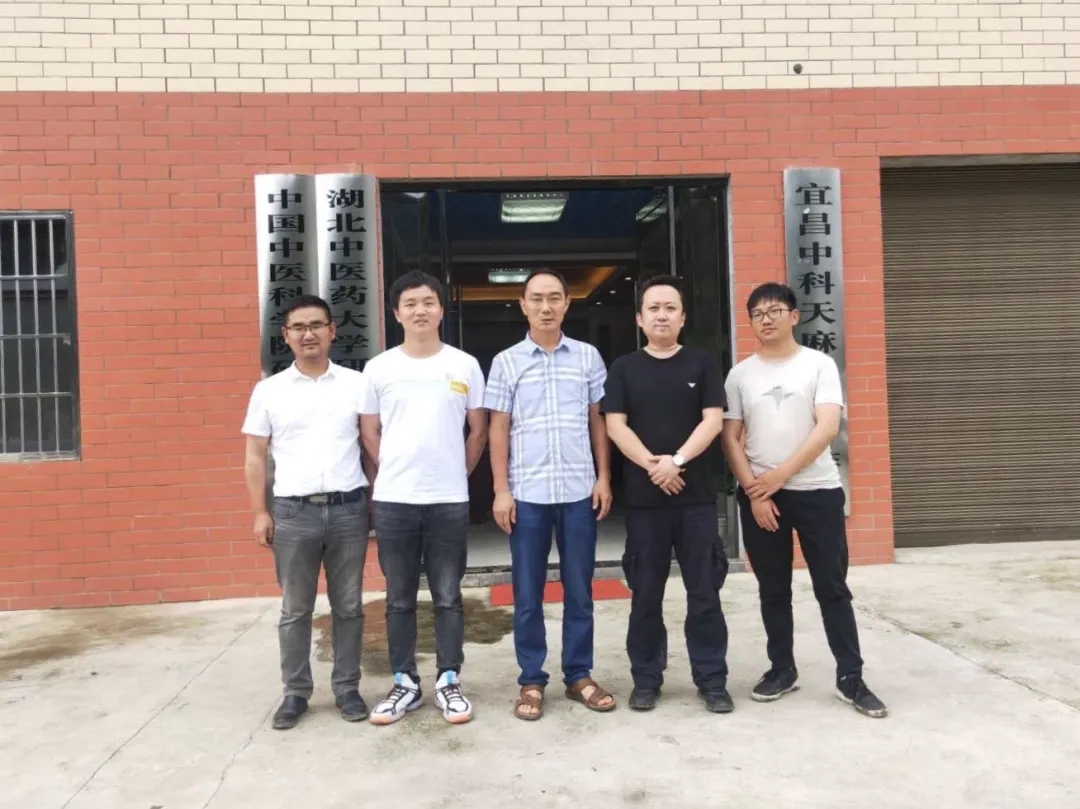 ▲神藥公司董事、總經(jīng)理薛超(右二)、宜昌市霧渡河鎮(zhèn)百部基地負(fù)責(zé)人秦發(fā)忠(中)同技術(shù)人員合影