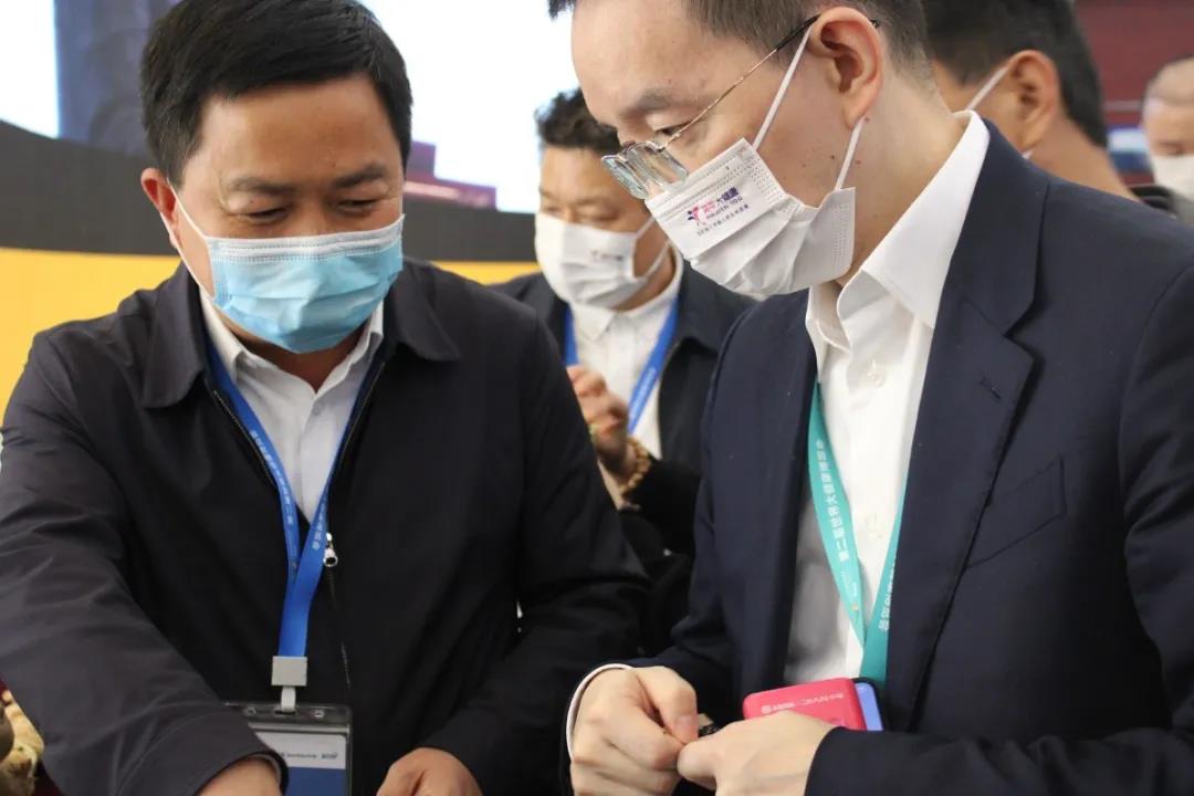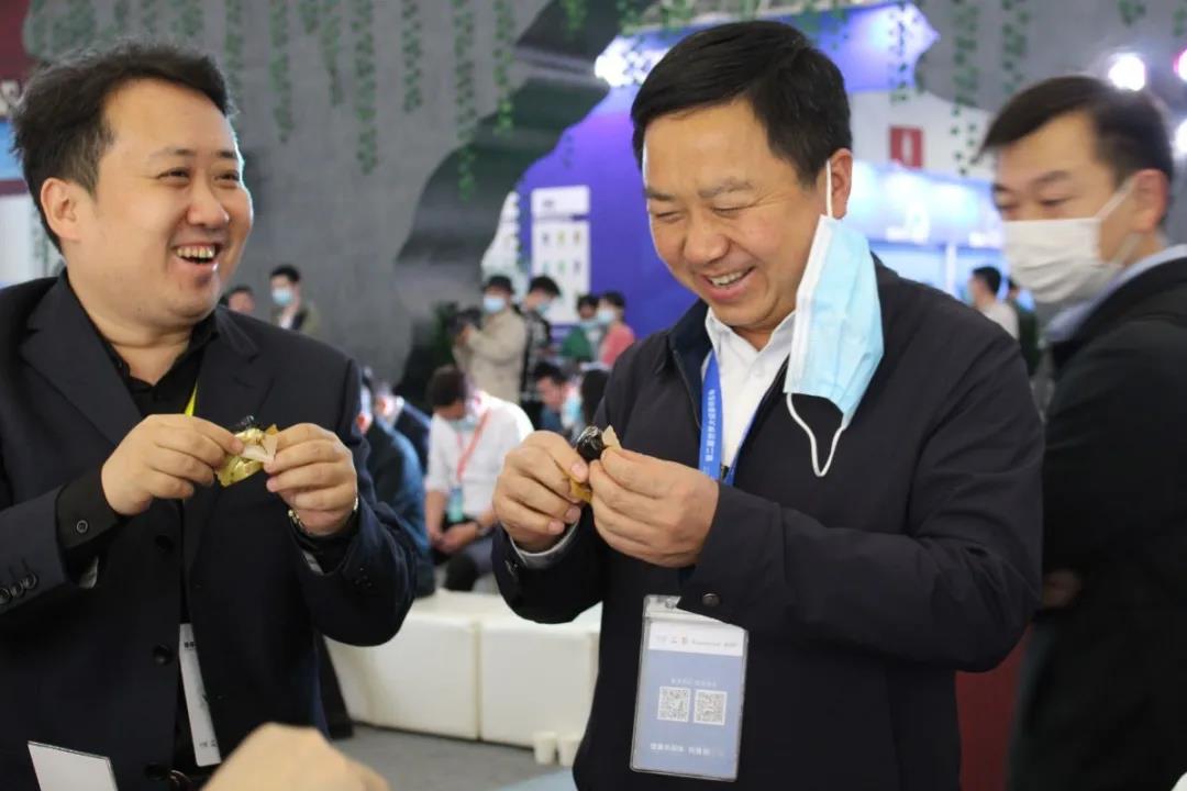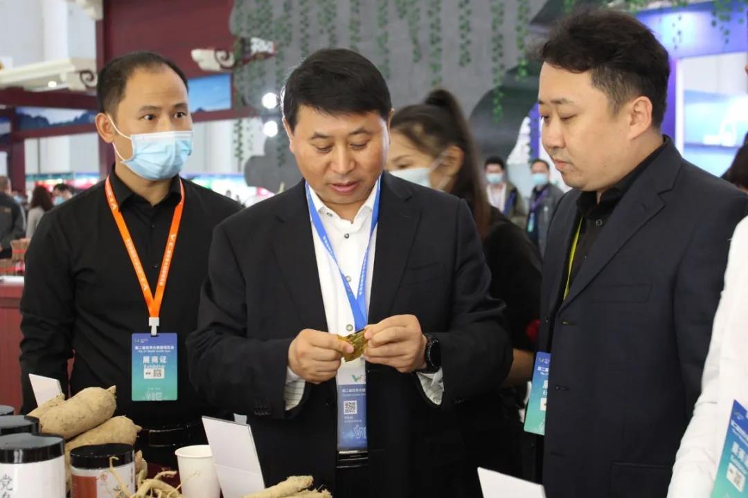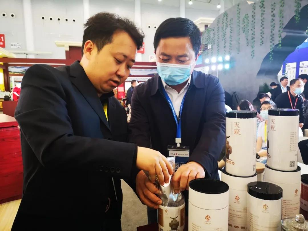 ▲神農(nóng)架林區(qū)黨委副書記、政府區(qū)長劉啟?。ㄓ遥┰谏袼幑究偨?jīng)理薛超(左)的陪同下蒞臨神藥公司展位進(jìn)行巡館視察,現(xiàn)場了解神藥最新產(chǎn)品,并品嘗藥食同源產(chǎn)品。