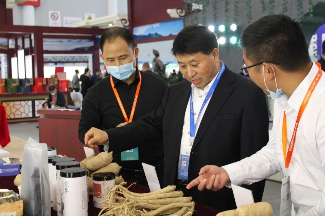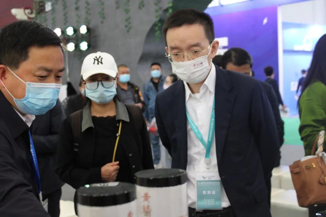 ▲神農(nóng)架林區(qū)副區(qū)長沈紹平(中)現(xiàn)場參觀神藥公司展位、品嘗藥食同源產(chǎn)品。